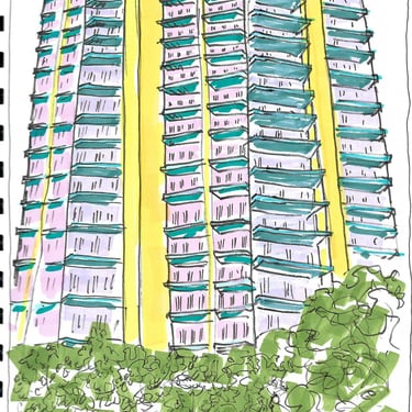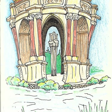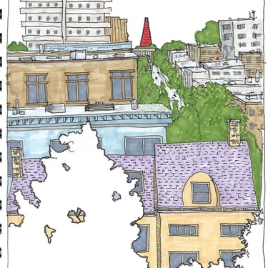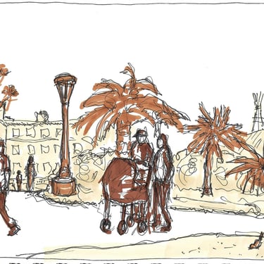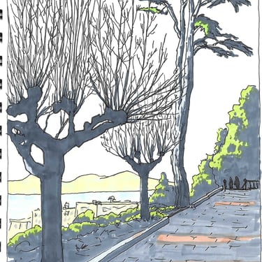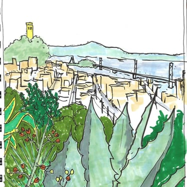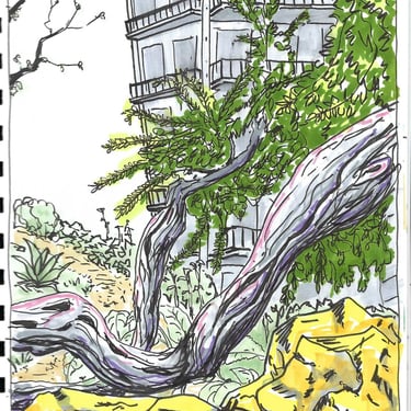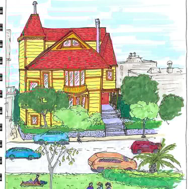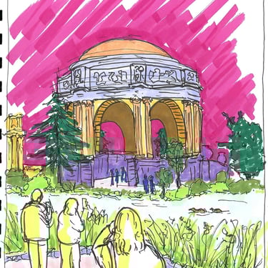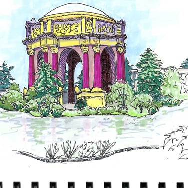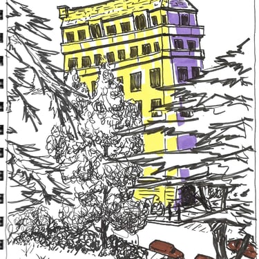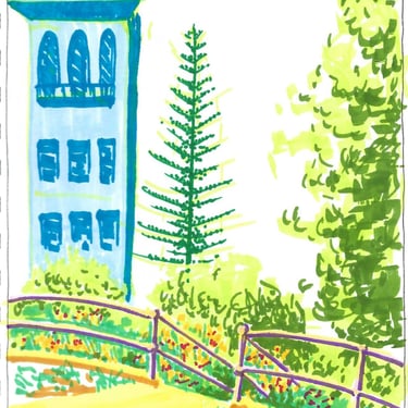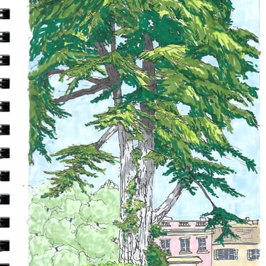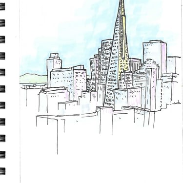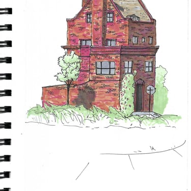 I used a Bee Paper Marker Journal 5.5 " x 8" (14 cm x 20.3 cm), Pitt fineliners or Pitt FM. I sketched on-site and colored with alcohol markers at home.