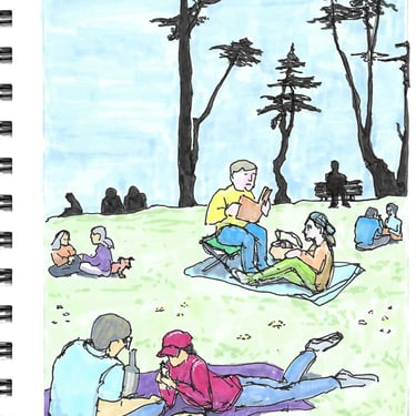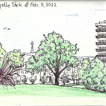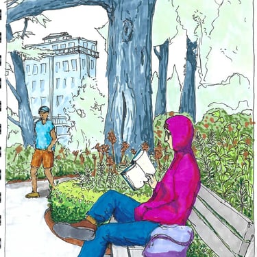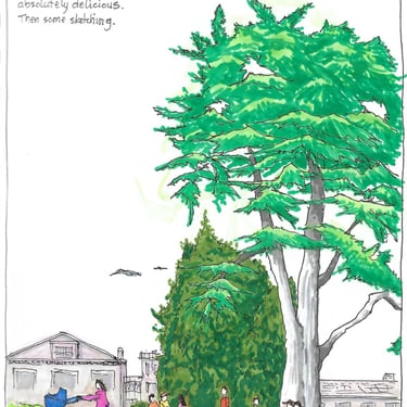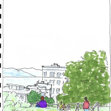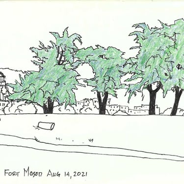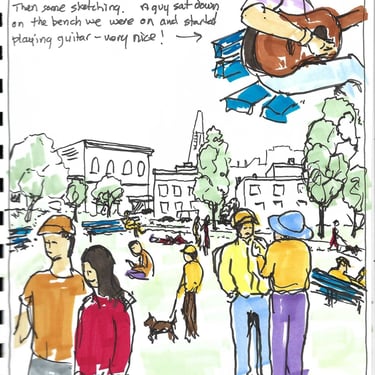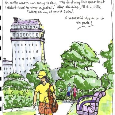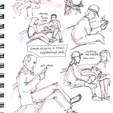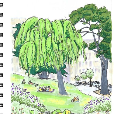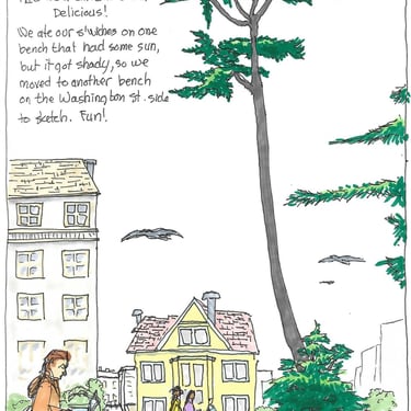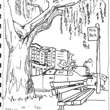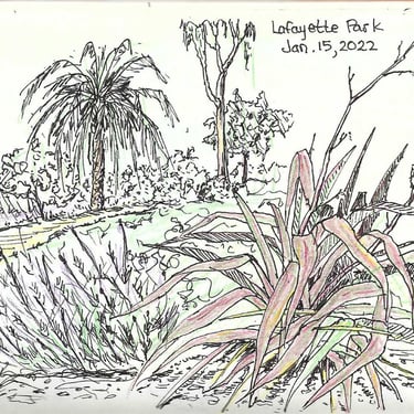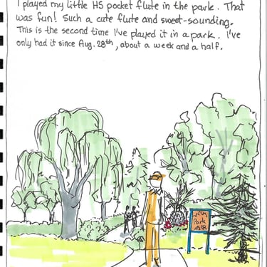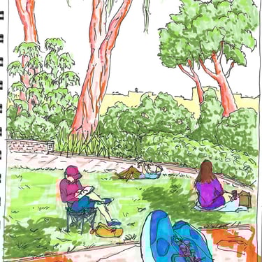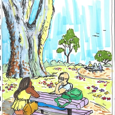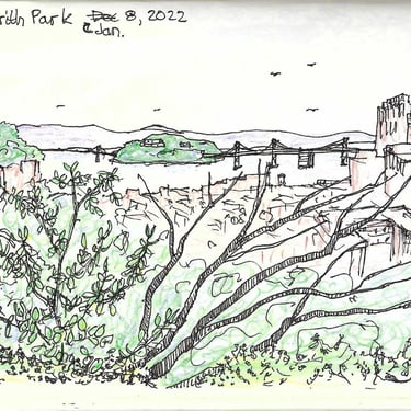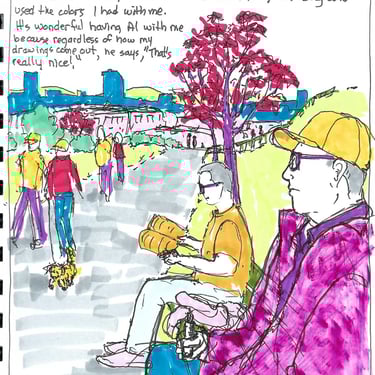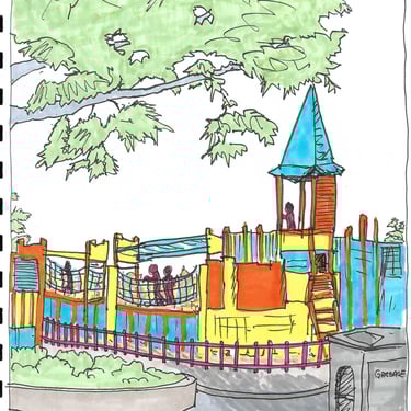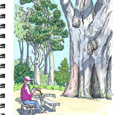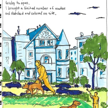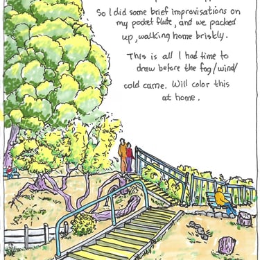 I like to sketch and color on site, but a couple of the sketches I colored at home. There are several parks that we go to frequently, and it's fun to draw the same scene a different way, or to find a new part of the park to draw.