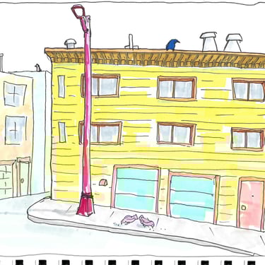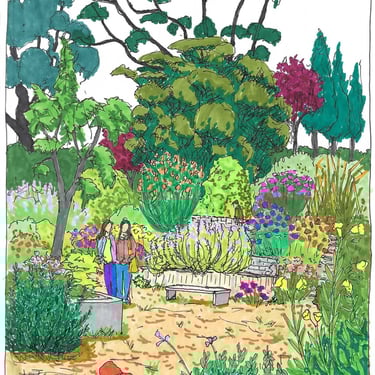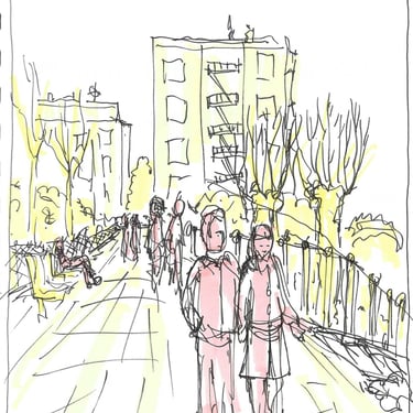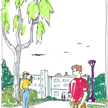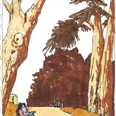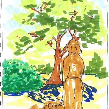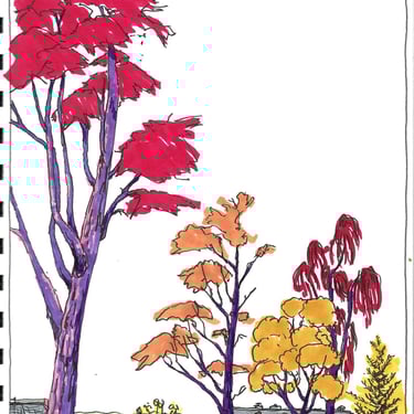 These were fun to do (regardless of how they came out)! On many of these I played around with leaving more white space. I experimented with a monochrome theme on the purple trees. On the next one (yellow background and orange people), I sketched that more hurriedly because I wanted to go home and have lentil soup.
