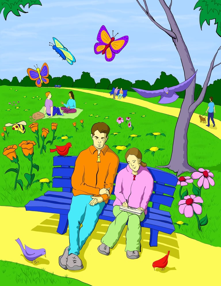 I enjoy going with Al to a neighborhood park and sketching. We often bring deli sandwiches with us. I love eating! Honestly, I think that my favorite activity is eating. Anyway, after finishing our delicious sandwiches, I look around waiting for something to click or inspire me or make me smile. Then I sketch. Once I get started sketching, I get very absorbed in what I'm doing, and that feels great. Almost as great as eating!
